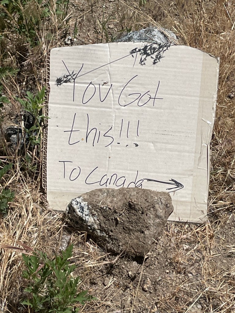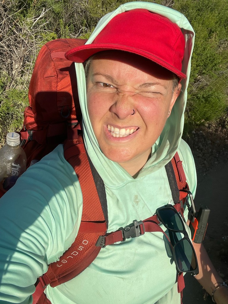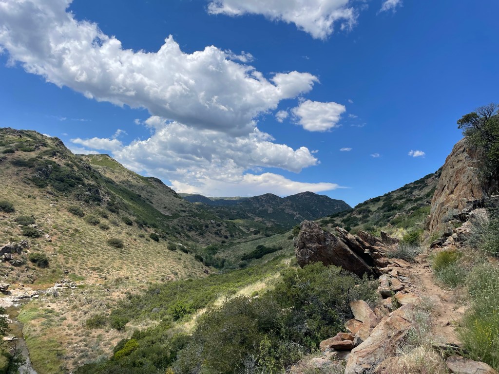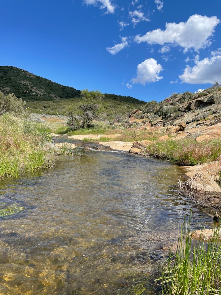 05/22/23 Miles 20.5-32: Monday. I woke up early, refreshed and ready for the day. The pain in my leg hasn’t gotten worse, but it hasn’t improved. 🤷🏻♀️ My usual mentality for things like this is rub some dirt in it, keep going, it’ll be FINE, but being so far out from any kind of help and in unfamiliar territory has me feeling more cautious. I made 12 miles, but not without some crying under a bush on the mountain side because I was missing my people, hot, in pain, worried about the leg thing and tired. (Insert superhero girlfriend’s pep talk here.) Honestly eating more regularly would have fixed 98% of these problems. From here on my whole routine has changed. Early start, water myself every two miles, feed myself every 5 miles if not more and a good long break during the crazy mid day heat, then back to it in the afternoon. For me a schedule like this has kept me chugging along and looking forward to something. Although I went through the entire range of emotions, the afternoon of hiking this day was my favorite and the most beautiful yet, high on the hill side looking down at Kitchen creek, which I was able to hike down to, to sit on big smooth rocks and enjoy the creek and views. I camped with some lovely, familiar faces in Fred Canyon, it was a cold night but I slept well. Getting out of your tent to pee in the middle of the night is the worst, but you get to see the stars, just make sure you point your head lamp at the bushes before you squat.