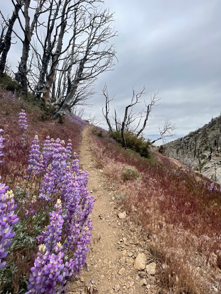 I love waking to birdsong in the early morning hours. I love the stars. It’s an affair I’ll never get tired of. I love the sunrise equally as much as the sunset. I love “hiker midnight” bed time before 8pm. I love the aroma of the sun baked earth, the pine needles, the dirt, and the wild flowers. I love the very random butterflies that flutter by, specifically the monarchs, who, I believe to be my dad watching over me. I love a good, cool breeze in the hot afternoon sun and the hot sun after a river crossing or walk through the snow. I love the downhill bits to give my legs and lungs a rest, but also the uphill bits to give my knees and toes a rest, the flat bits really are the best. I love the brave, beautiful, hummingbirds that dive bomb my head, then hover 10 inches in front of my face, look me dead in the eyes like I offended them and flit off into the atmosphere. I love me a good picnic table. I love making new trail friends, but bumping into old trail friends, who you thought you’d never see again, is priceless and an instant high. I love looking back at the trail to see where I came from… it blows my mind every time. I love seeing and feeling my own progress in my body. Making miles you weren’t sure you’d make. I love how every hiker is a friend, even though the motto is to “hike your own hike” we look after each other.